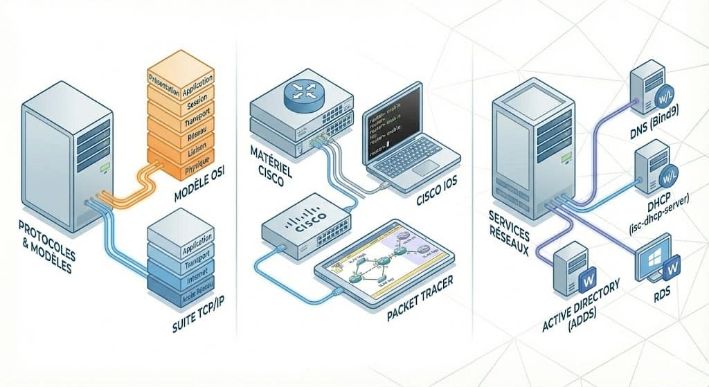 Matériel Cisco : Configuration via Cisco IOS, simulation d’architectures réseaux (routage, switching, VLAN) sur Cisco Packet Tracer